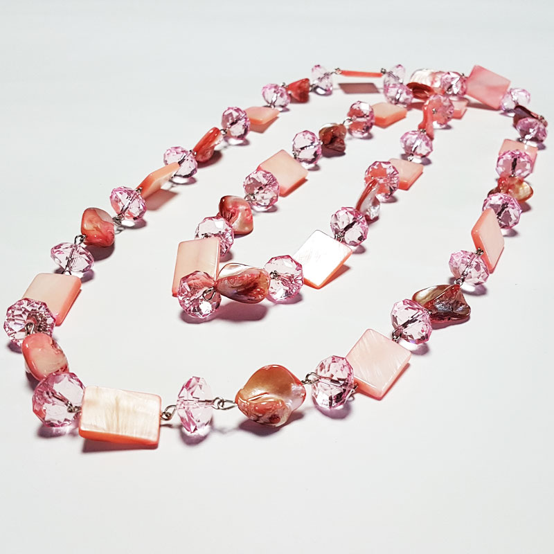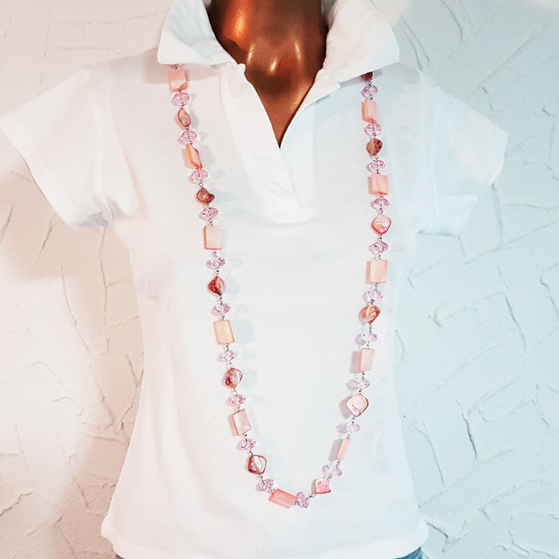 Die 114 cm Halskette Rosé mit Perlmutt ist eine in sich geschlossene Halskette mit Perlmutt-Nuggets, Perlmutt-Plättchen und künstlichen Glassteinen auf Schmuckdraht aufgefädelt. Lieferung im Aufbewahrungsbeutel aus 100 % Baumwolle ohne Deko.