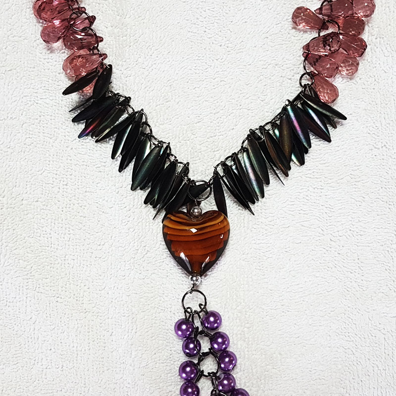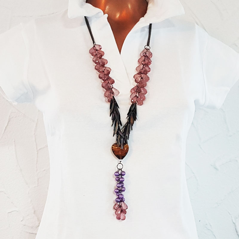 Mehrreihige Halskette Herz Goldfluss in 78 cm Länge. Die lila/rosa Kunst-Perlen, die blattförmigen Metallplättchen und die 3-reihige Gliederkette in Verbindung mit dem golden schimmernden Herz (synthetischer Stein) spiegeln den Vintage-Charme der Statement-Kette wieder.