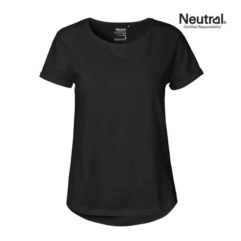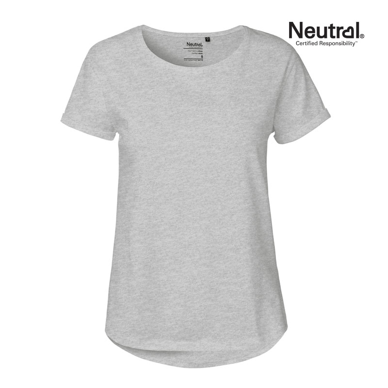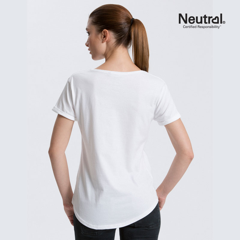 Das Damen T-Shirt mit Rollärmeln von Neutral® ist ein T-Shirt mit hochgekrempelten Ärmeln, weitem Rundhalsausschnitt mit Elasthan-Ripp und innenliegendem Nackenband.
